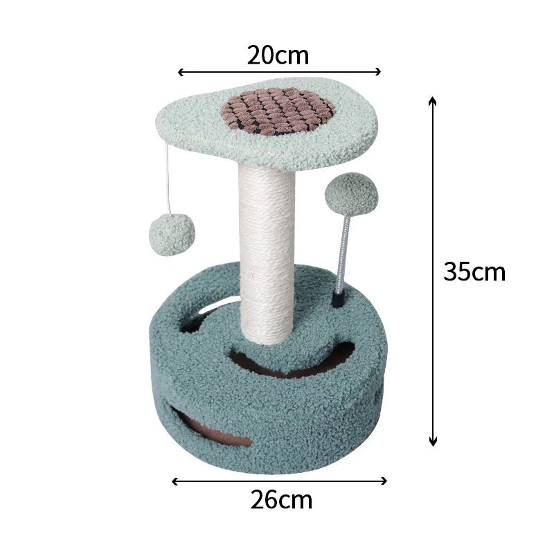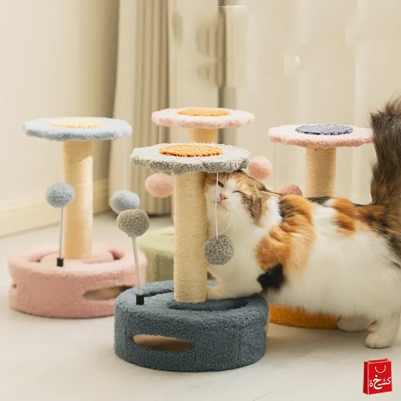 شجرة صغيرة للقطط بالإضافة إلى خداشة، وقاعدة مجوفة تحتوي على كرات تساهم في تسلية القطط وتطوير مهاراتها الحركية بالإضافة إلى كرة قطنية متدلية وجرس.