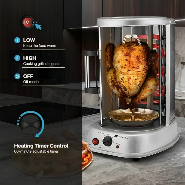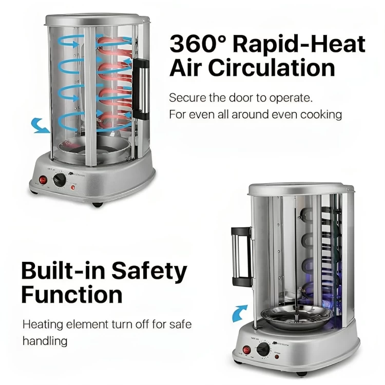 تمتاز الشواية العامودية بأنها أسرع طريقة وأكثر كفاءة لشواء اللحوم والدجاج. تستطيع الشواية تحمير كمية كبيرة من اللحوم بوقت قصير. تعمل الشواية على طهي اللحوم بعصائرها الداخلية عند الإلتفاف مع تجفيف الدهون غير المرغوب بها وتصريفها في صينية قابلة للإزالة للحصول على نتائج صحية أكثر