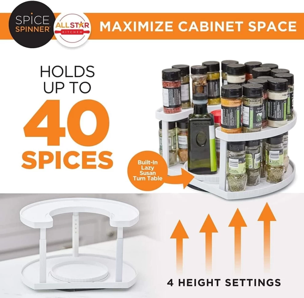 صُمم هذا المنظم الموفر للمساحة ليوفر أقصى استفادة من مساحة مطبخك أو مخزنك أو سطح العمل، مع الحفاظ على زجاجاتك وتوابلك مرتبة بشكل منظم. بفضل رفه الدوار المزدوج، يمكنك الوصول بسهولة إلى أغراضك دون عناء.