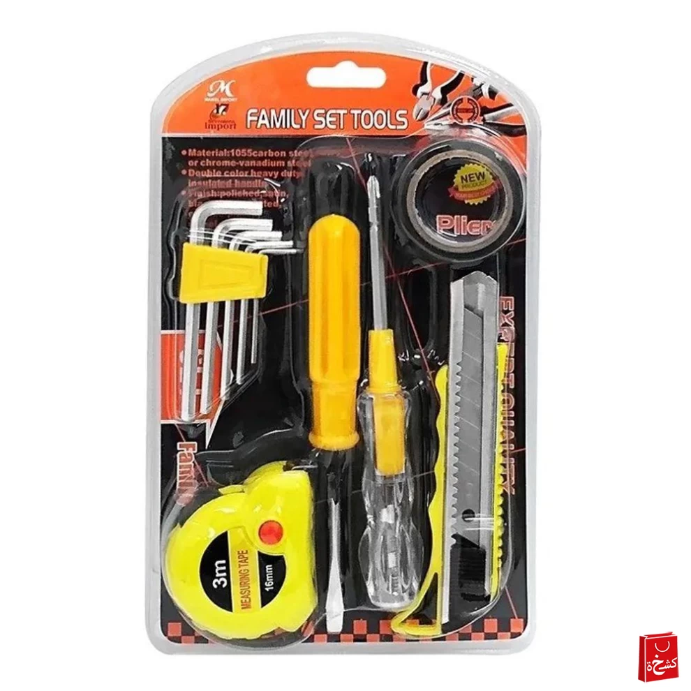 📦 الطقم يتضمن: 1 مطرقة، 1 مفك، 1 مفتاح، 1 شريط قياس، 1 سكين متعدد الاستخدامات، 1 كماشة