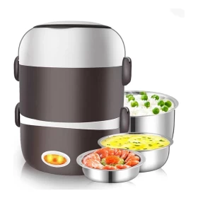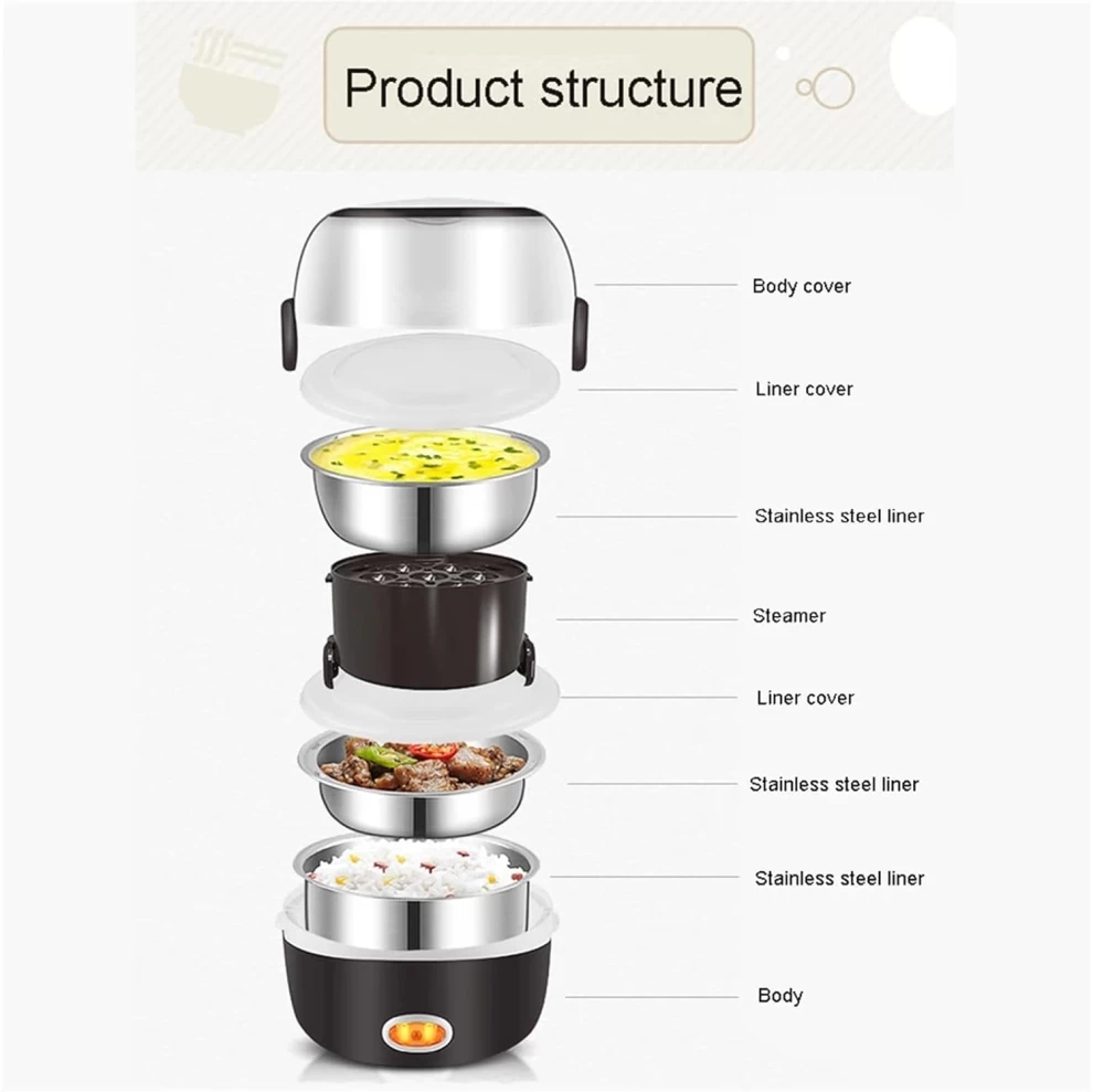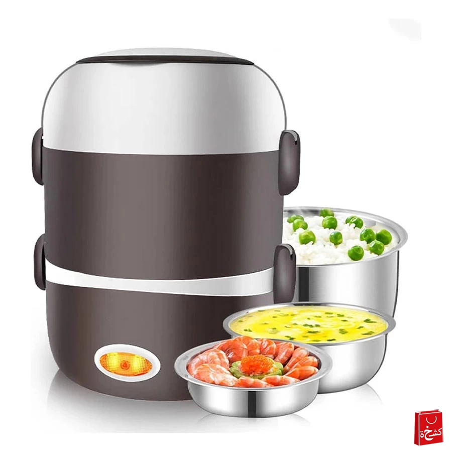 🍱 صندوق غداء كهربائي 2 لتر – 3 طبقات للتسخين والبخار، محمول مع حافظة ستانلس ستيل
