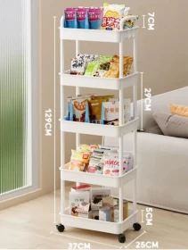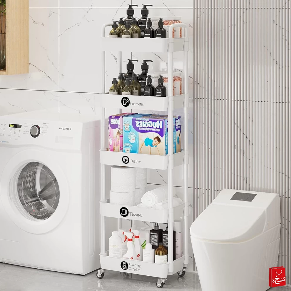 رتب منزلك بسهولة مع رف التخزين البلاستيك المكون من 5 طوابق بعجلات — الحل الأمثل لتنظيم المساحات في المطبخ، غرفة المعيشة، الحمام، المكتب، أو أي مكان آخر. تصميم قوي وأنيق مع سلال عميقة وعجلات مرنة لسهولة التخزين والحركة.