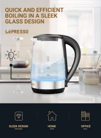 أضف لمسة من الأناقة والعملية لمطبخك مع غلاية ليبريسو الزجاجية الشفافة السريعة الغليان. تتميز بـ تصميم زجاجي فاخر، قاعدة دوارة 360°، وتقنية الغليان السريع، مما يجعلها مثالية لتحضير الشاي، القهوة، الوجبات الفورية أو الاستخدام اليومي. آمنة، سهلة الاستخدام، وأنيقة – مثالية للمنازل والمكاتب.