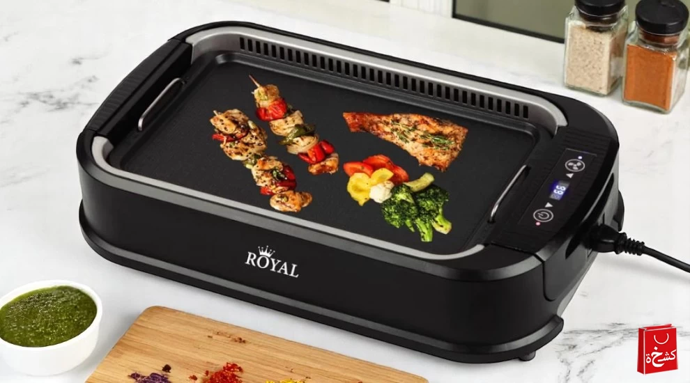 استمتع بتجربة الشواء بكل سهولة داخل المنزل مع الشواية الكهربائية الملكية Royal Electric Grill – الحل العصري لطهي اللحوم الطرية، والدجاج، والكباب، وحتى الخضروات بنكهات الشواء الأصيلة!