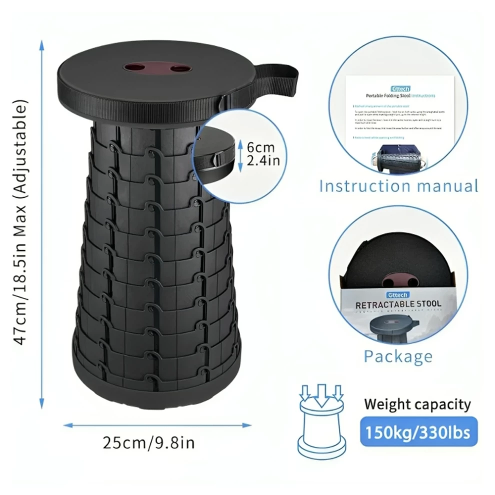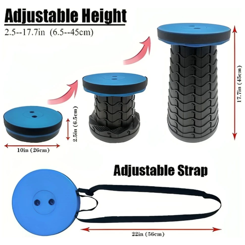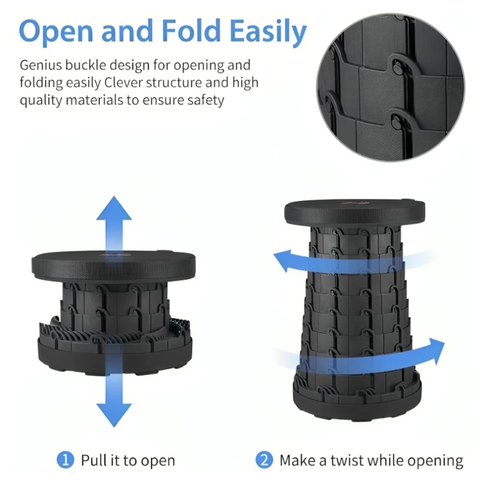 Enjoy comfort anywhere, anytime with this compact and durable telescoping stool. Whether you’re outdoors or indoors, it unfolds instantly and adjusts to your desired height — strong enough for adults, light enough for kids!