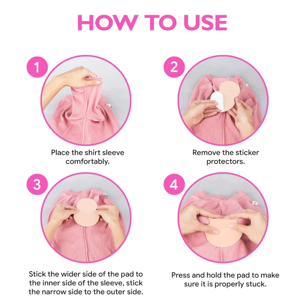 Stick the adhesive side of the pad directly to the inside of your clothing, where your underarm rests.