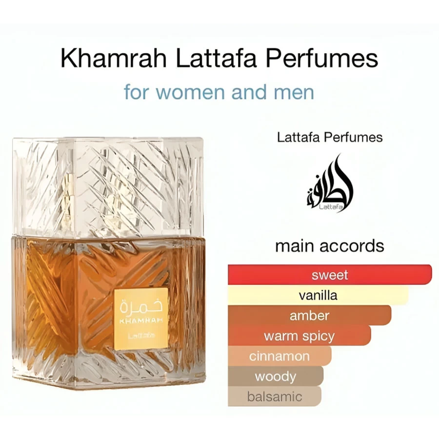 Khamrah by Lattafa is a luxurious unisex fragrance that wraps you in warmth and elegance. With its spicy sweetness and bold woody base, it’s perfect for those who want to leave a lasting impression wherever they go.