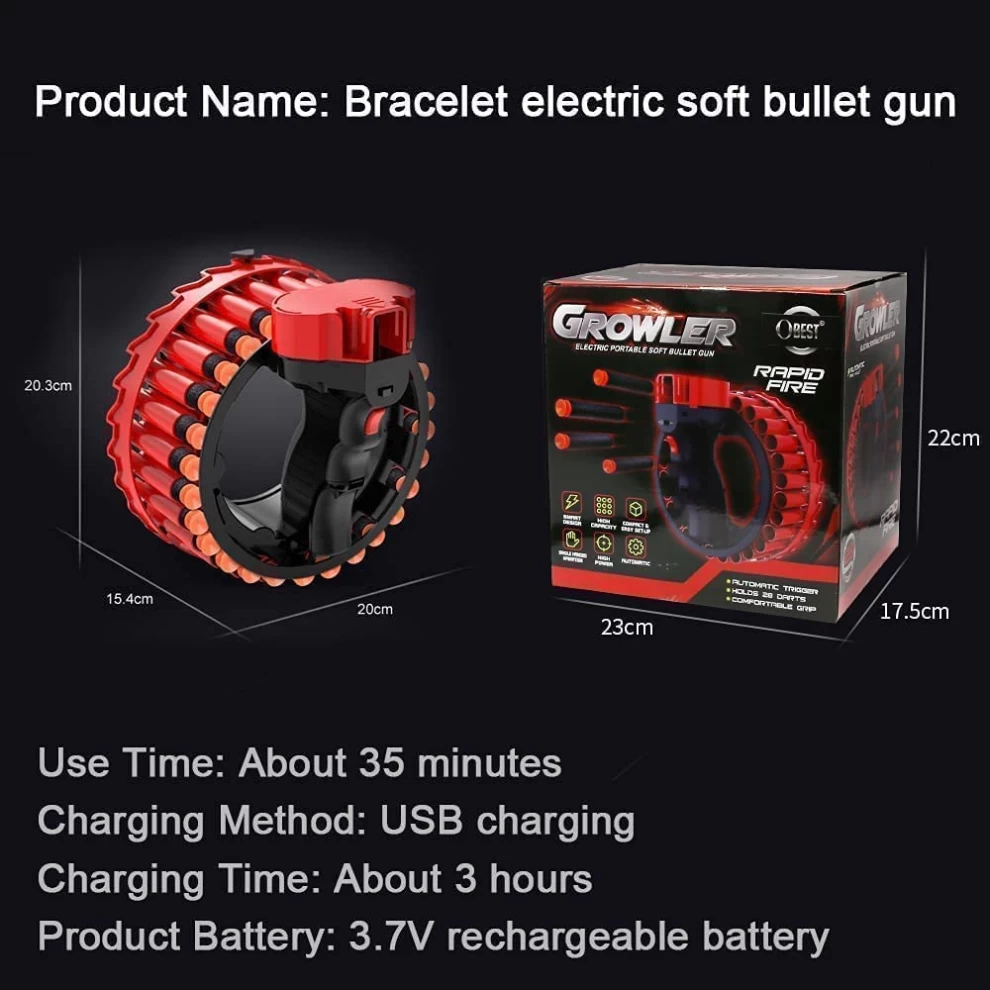 • After firing the last Bullet, it automatically prepares for the next Bullet with an electric blast launch for endless fun. A USB charging cable is included in the package and can be used for about 35 minutes after a full charge.