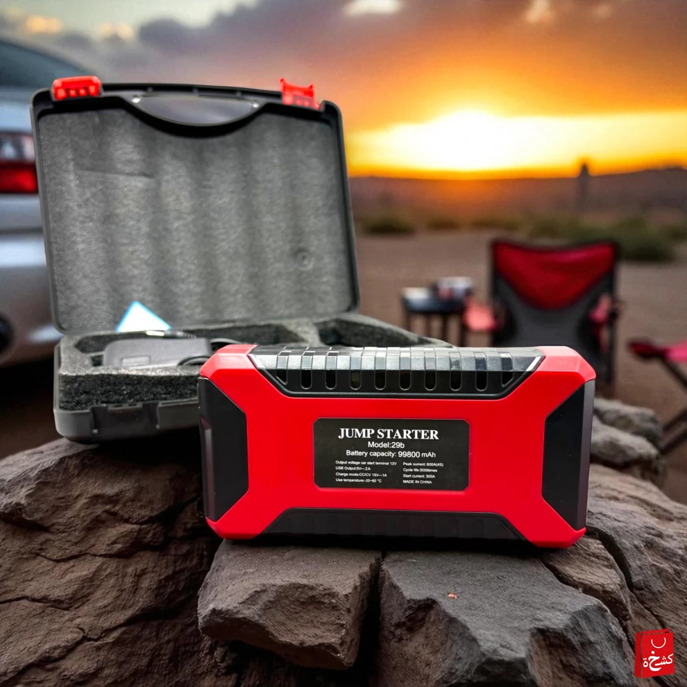 Whether you’re heading out for a weekend adventure, a long-distance road trip, or daily driving across the city — don’t leave without this powerful and portable 99800mAh Car Jump Starter (Model 29B). It’s more than just a jump starter: it’s a compact emergency survival tool packed with a huge battery, 4 USB charging ports, built-in white flashlight, and flashing red/blue emergency lights — all safely stored in a travel-ready EVA case. 🚙🌄