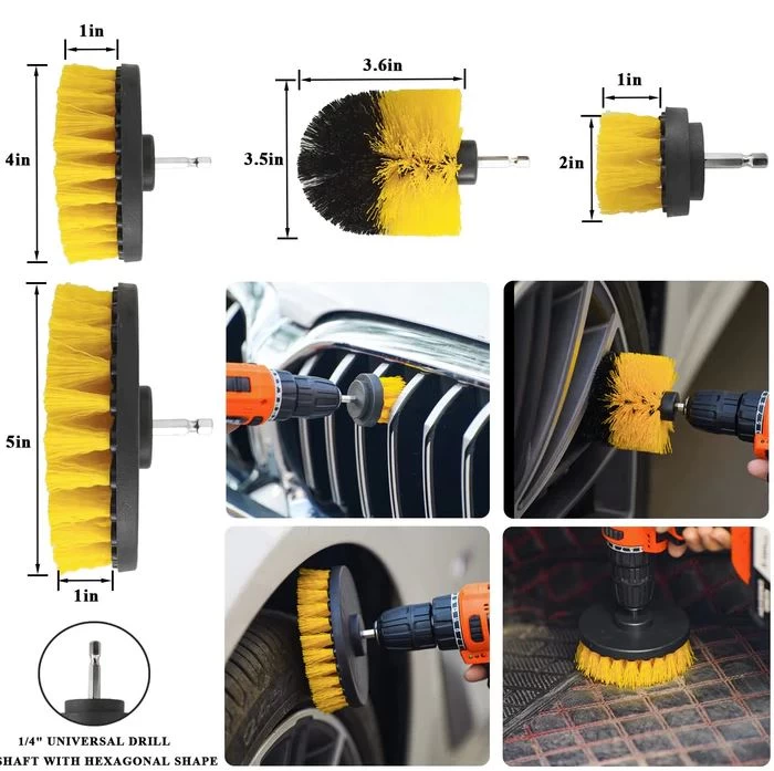 • 🛠 Multi-Size Drill Brush Attachments – 4 different sizes and shapes of medium-stiffness nylon brushes easily clean wheels, carpets, bathrooms, kitchens, and tiles—without scratching.