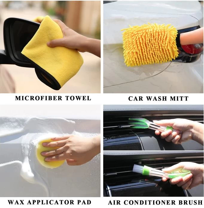 • 🧰 All-in-One Cleaning Kit – Comes with towels, mitts, applicator pads, a window scraper, and even a stone hook for tires—everything you need for full car detailing in one box.