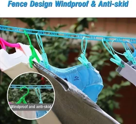 The camping clothesline is small and lightweight, with a special grid design and dividers to separate the clothes and prevent them from rolling up and falling off. Don't worry about it being blown away by the wind.