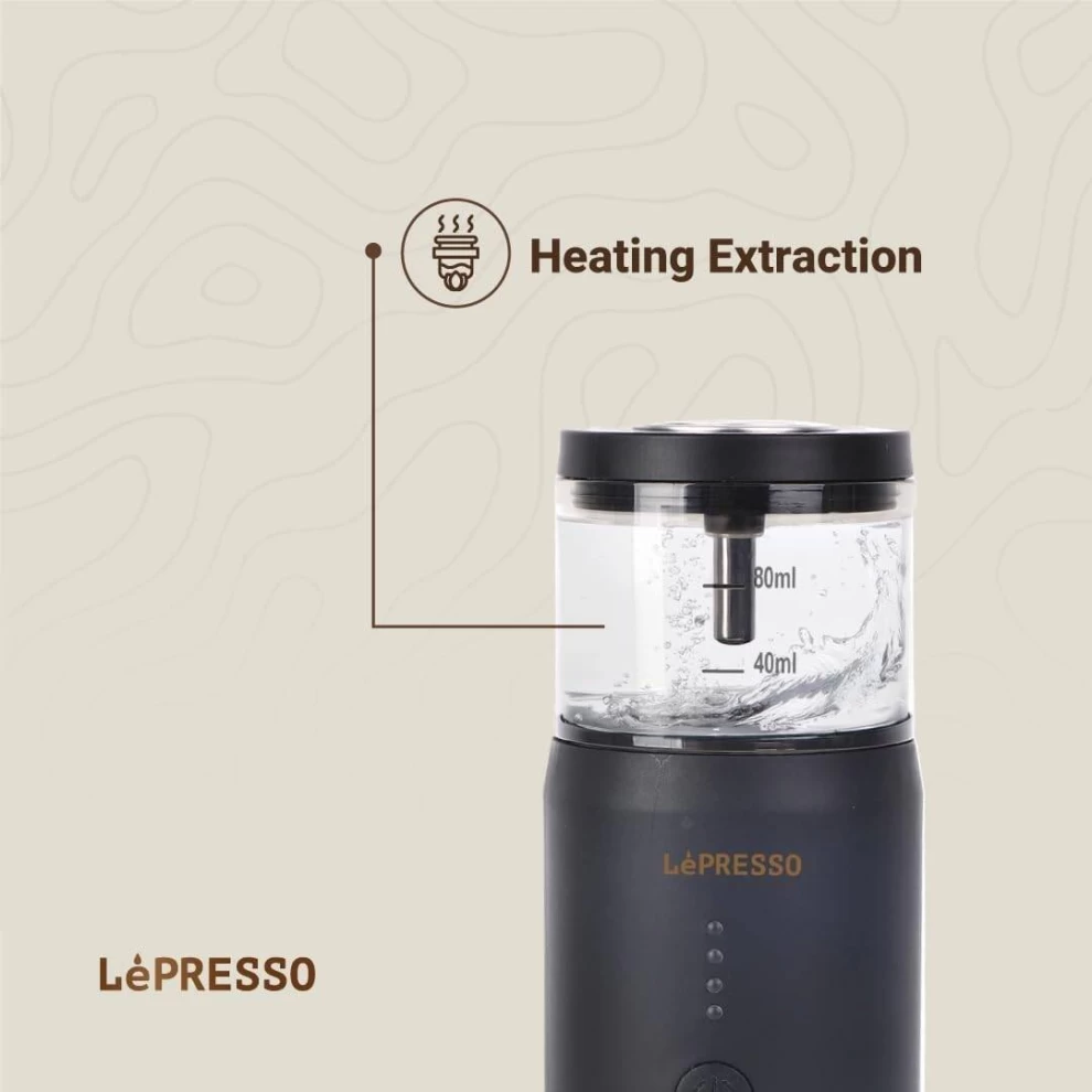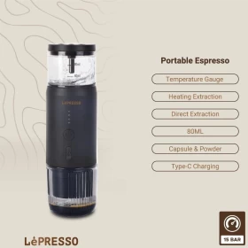 Enjoy a perfect espresso anywhere with the LePresso Portable Espresso Coffee Machine. Equipped with a thermal meter and USB-C self-heating technology, this compact machine ensures 15-bar extraction pressure for rich coffee while you're traveling, camping, or on the move.