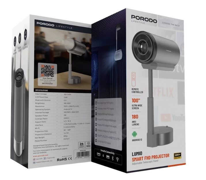 📽️ Porodo Lifestyle Lumio Smart FHD Projector | Portable Home Cinema 🎬✨