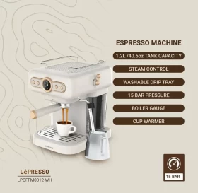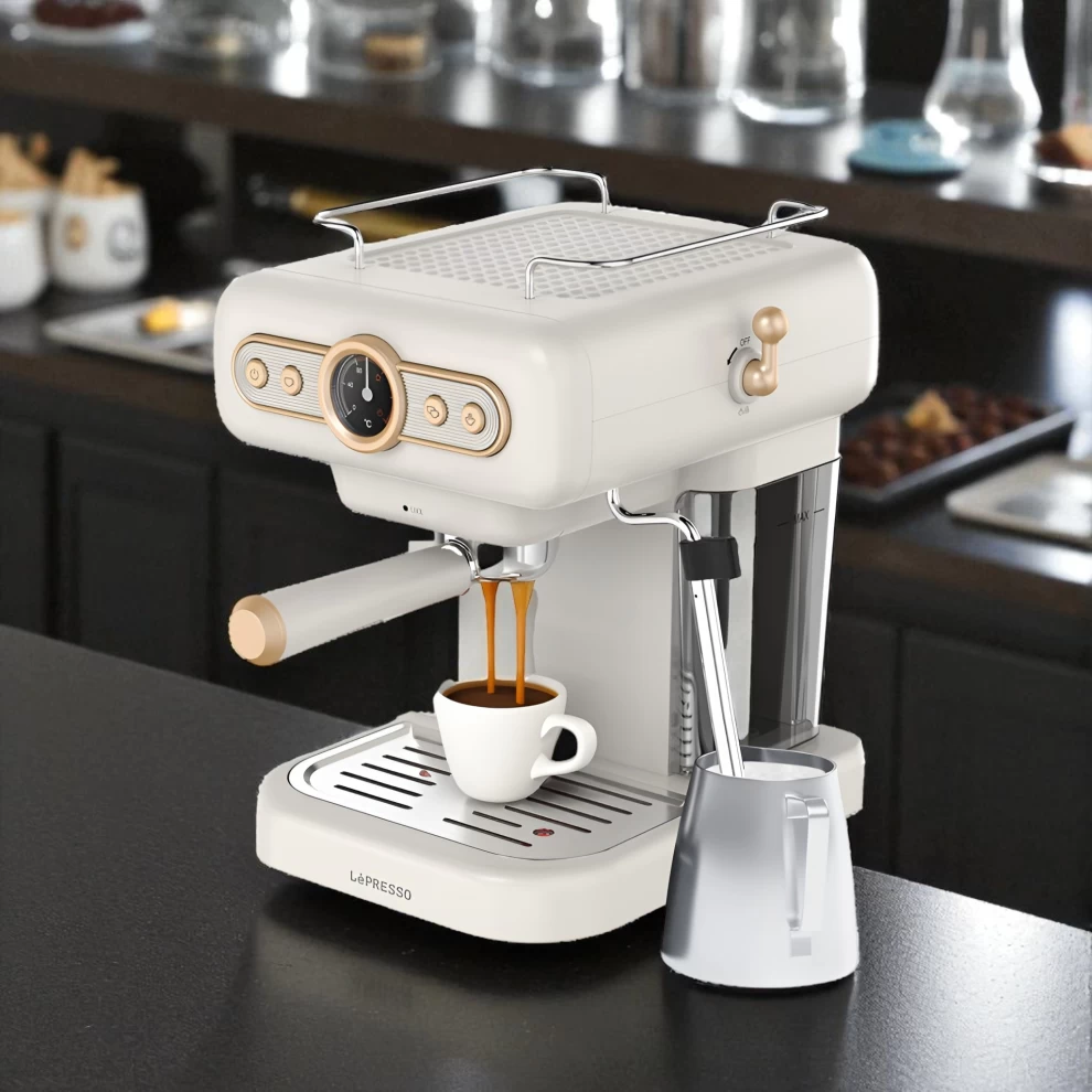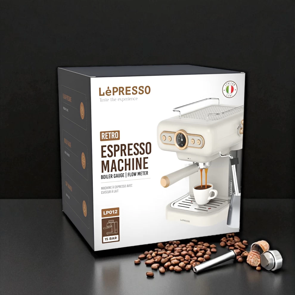 Bring the café experience to your home with the LePresso Retro Espresso Machine. Featuring a stylish vintage design, a built-in boiler pressure gauge, and a professional milk frother, this machine is made for espresso lovers who want both performance and elegance. Perfect for brewing espresso, cappuccino, and lattes, it delivers barista-level coffee in a compact, easy-to-use design.