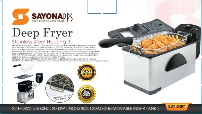Fry your favorite foods quickly and evenly with the Sayona Electric Deep Fryer 3L. With a stainless steel body, adjustable temperature, and safety features, this fryer is perfect for fries, chicken, fish, and snacks. Compact yet powerful, it brings restaurant-quality frying to your home kitchen.