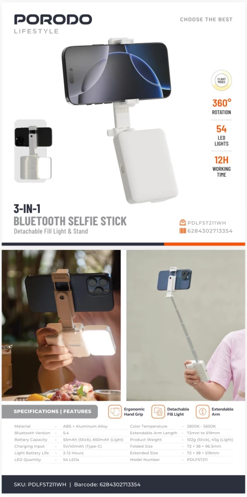 • 1 × Porodo 3-in-1 Bluetooth Selfie Stick