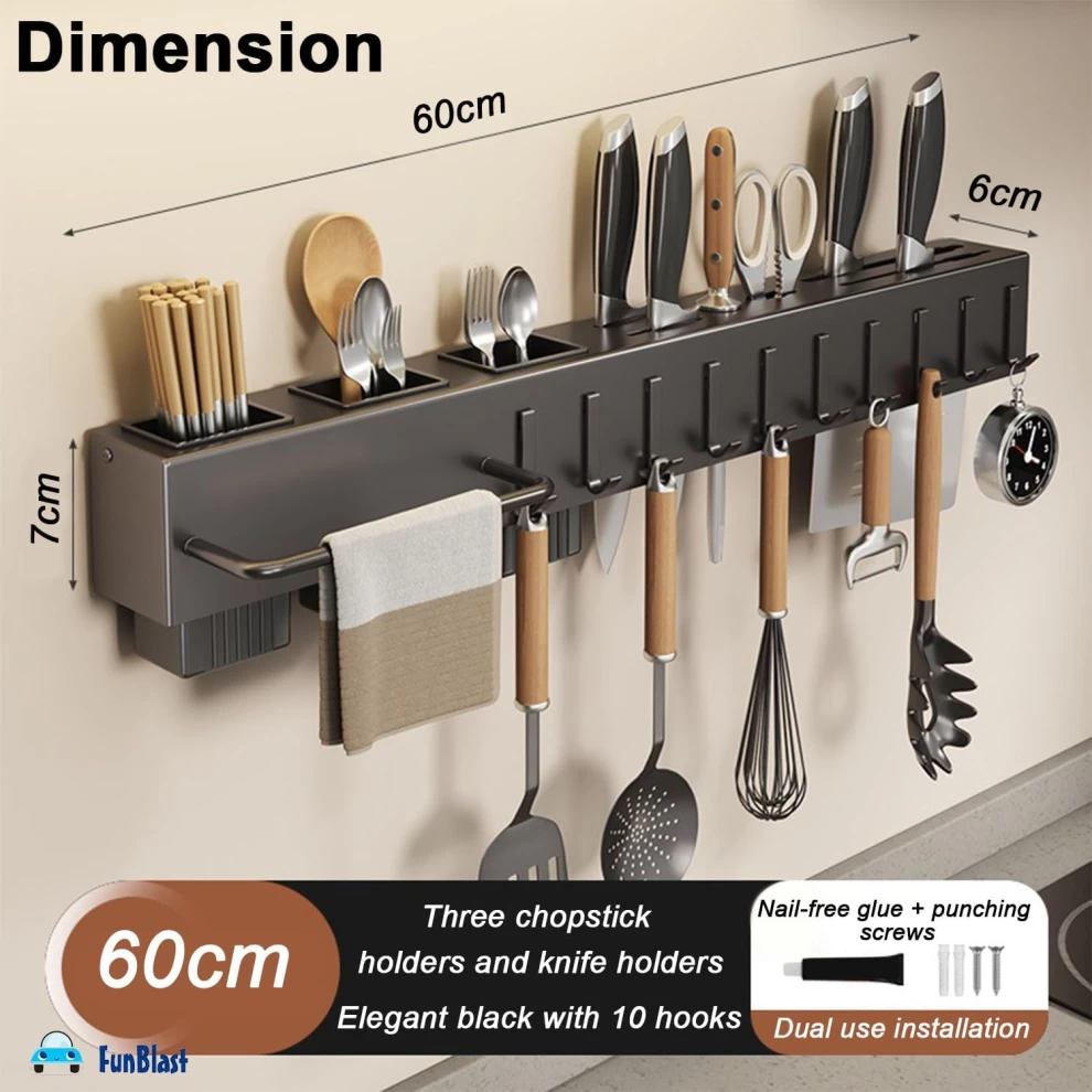 🍴✨ Wall Mounted Kitchen Shelf – 60cm Utensil Rack with Hooks & Towel Holder