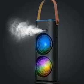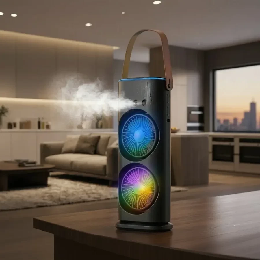 • ❄️ 3-in-1 Cooling System – Fan + mist spray + humidifier