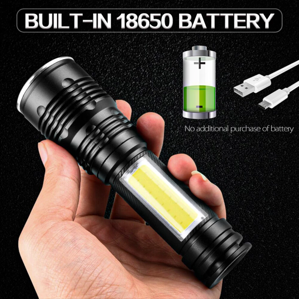 Stay ready for any situation with the COB LED Flashlight, a compact and powerful lighting tool designed for home use, outdoor adventures, repair work, and emergency situations.